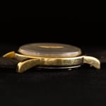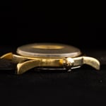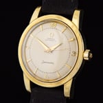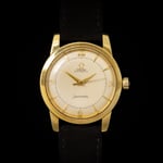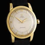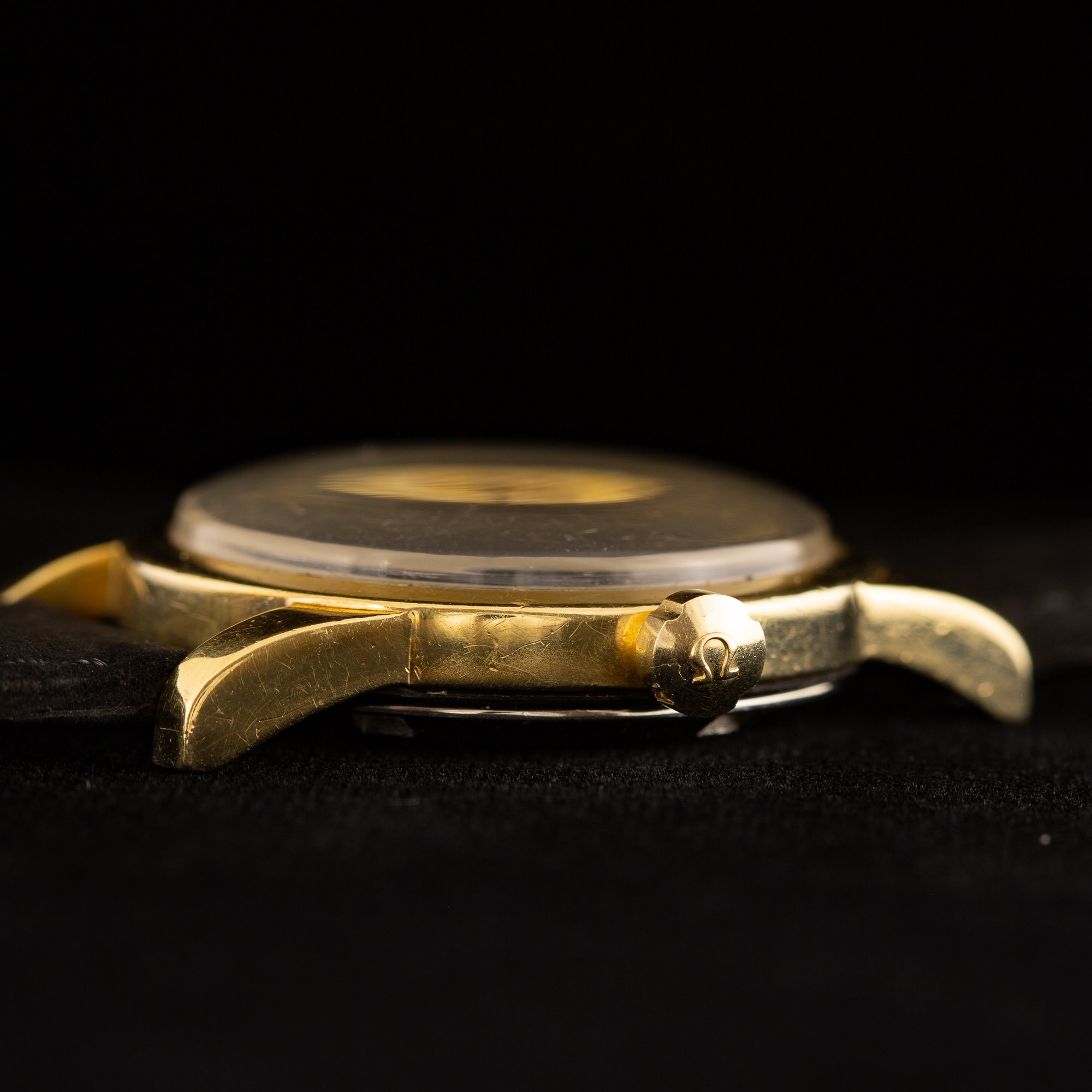 The 34.5mm gold-capped case features thick, well-defined lugs, commonly referred to by collectors as “beefy” lugs. The champagne dial displays a gold Omega logo beneath twelve o’clock along with applied Breguet numerals at three, six, nine, and twelve. Gold faceted dagger hour markers are paired with gold Dauphine hands, creating a lovely balanced aesthetic. The watch is fitted with an Omega-signed scalloped “clover” crown.