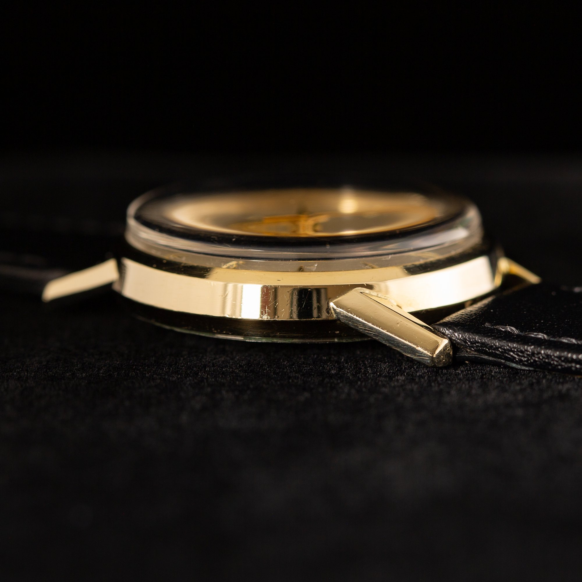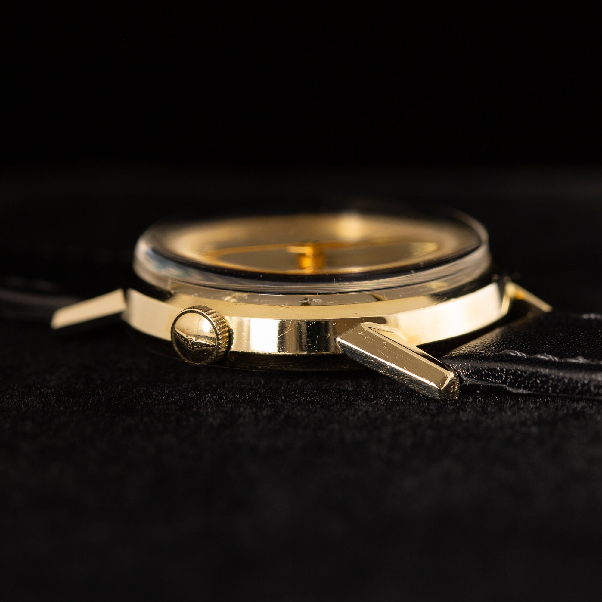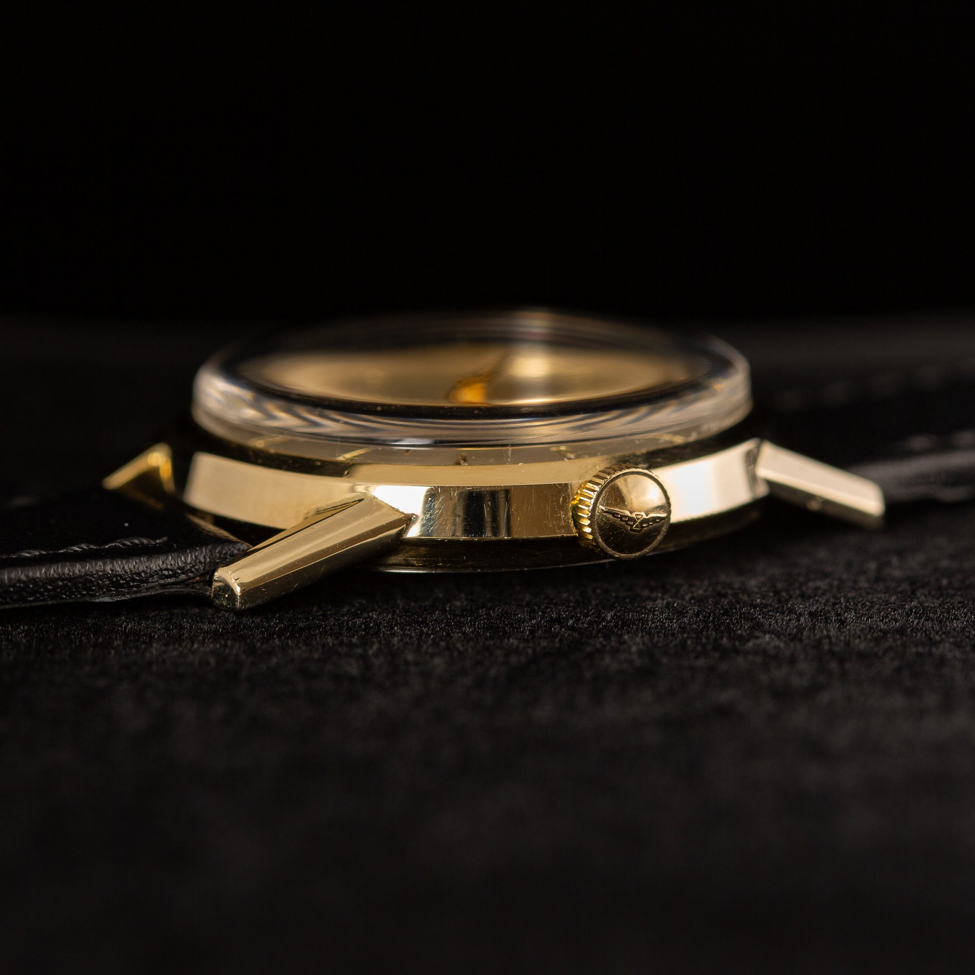 The 33mm 10k gold-filled midsize case houses a sunburst crosshair dial with an Explorer-style configuration. Gold-tone Arabic numerals at three, six, nine, and twelve are paired with dagger indices. A gold Longines logo sits beneath twelve o’clock. Gold Dauphine hands complete the dial design. The watch retains its signed crown.