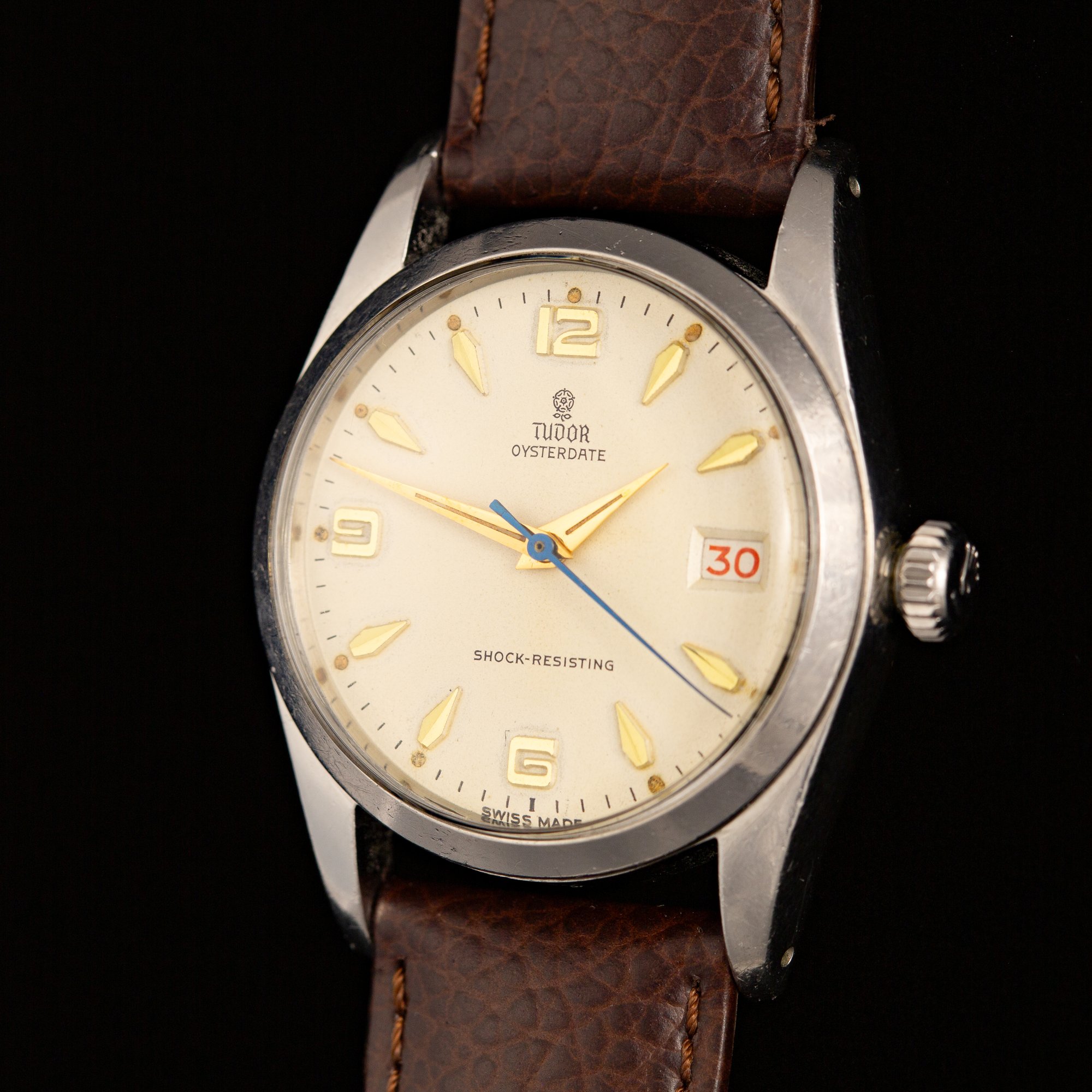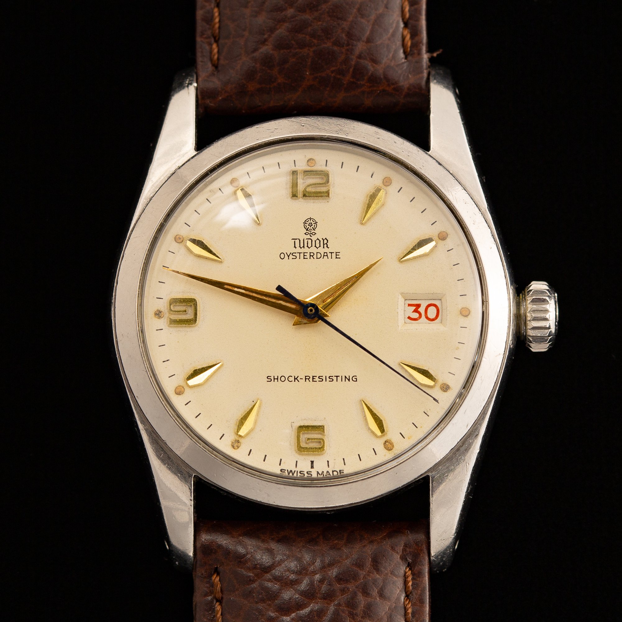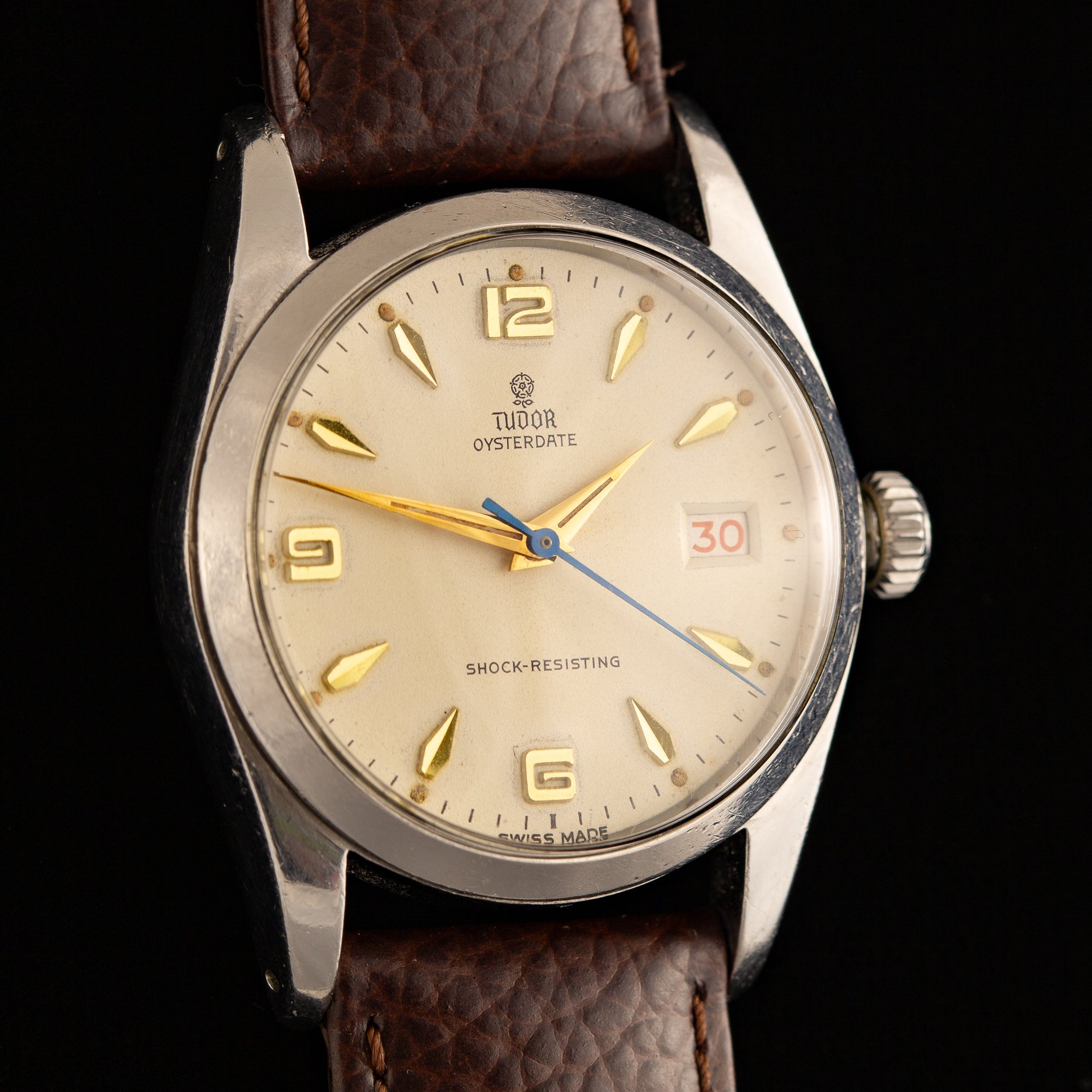 This Tudor displays a beautifully aged cream dial featuring the printed “Small Rose” logo beneath twelve o’clock, with “TUDOR OYSTERDATE” above center and “SHOCK-RESISTING” at six o’clock. The layout is Explorer-style, with stylized gold-toned Arabic numerals at twelve, six, and nine paired with gold-toned arrowhead markers. Gold-toned Dauphine hands and a heat-blued seconds hand complete the dial design. The original tritium lume has aged to a natural pumpkin patina, with loss to some lume plots and hand surfaces but nothing significant. A roulette date wheel displays alternating red and black numerals. The case features drilled lug holes and is fitted with a coronet-signed Twinlock crown.