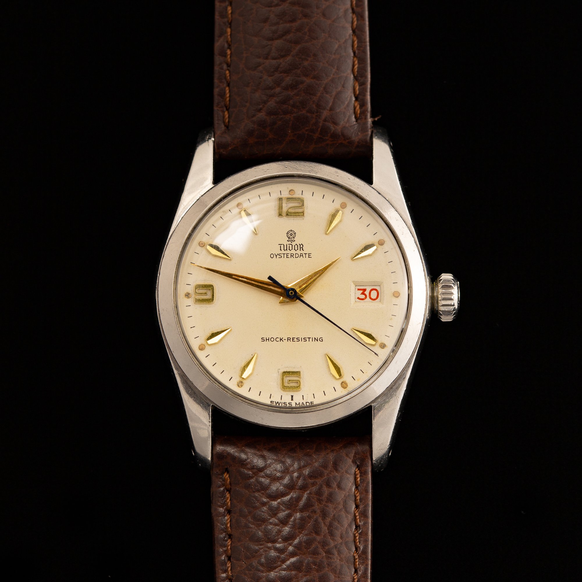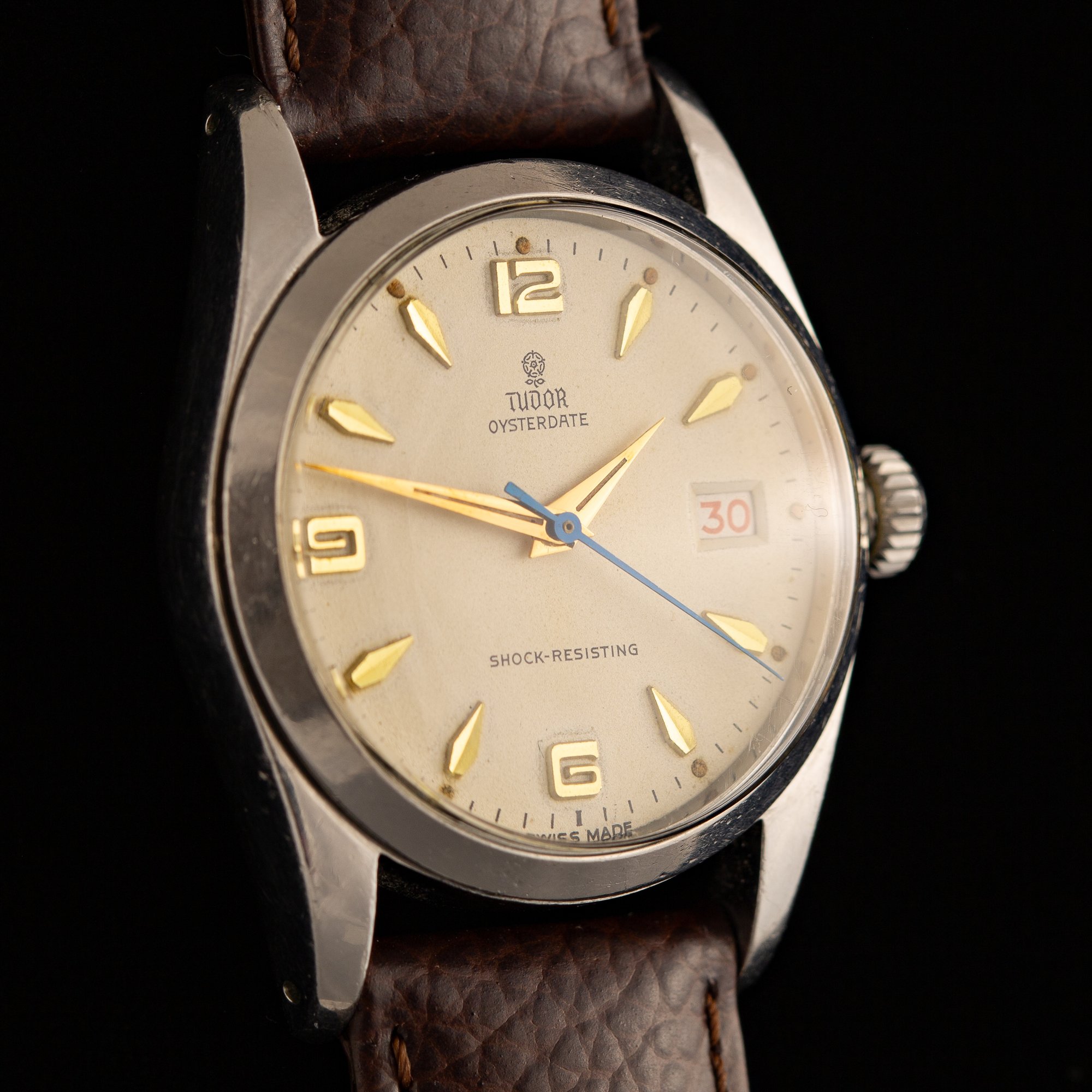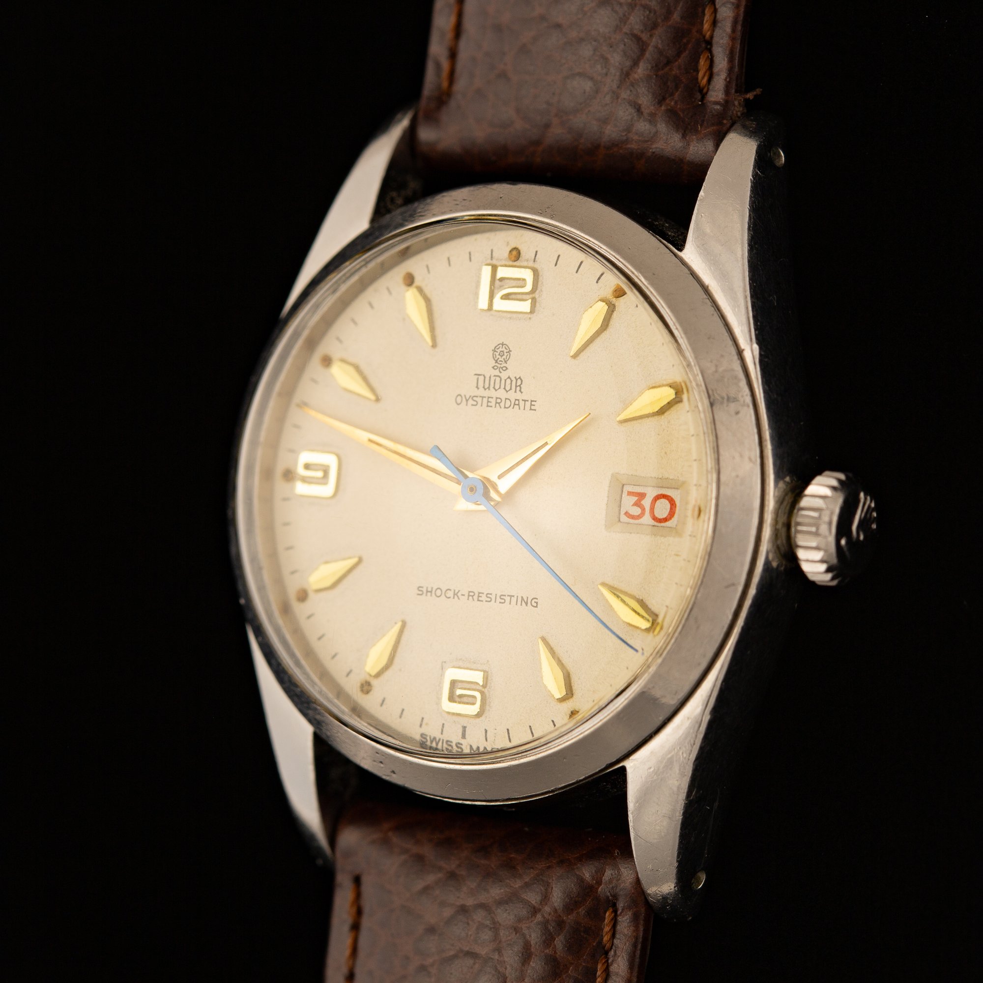 This Tudor displays a beautifully aged cream dial featuring the printed “Small Rose” logo beneath twelve o’clock, with “TUDOR OYSTERDATE” above center and “SHOCK-RESISTING” at six o’clock. The layout is Explorer-style, with stylized gold-toned Arabic numerals at twelve, six, and nine paired with gold-toned arrowhead markers. Gold-toned Dauphine hands and a heat-blued seconds hand complete the dial design. The original tritium lume has aged to a natural pumpkin patina, with loss to some lume plots and hand surfaces but nothing significant. A roulette date wheel displays alternating red and black numerals. The case features drilled lug holes and is fitted with a coronet-signed Twinlock crown.