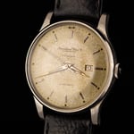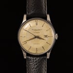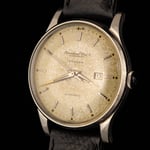 The 33mm midsize stainless steel case houses a pie-pan dial that shows well-developed tropical patina across the entire surface. The hands have patinated to match. Applied faceted Calatrava-style indices are paired with a date aperture at three o'clock. The watch retains its original signed "fish" logo crown.