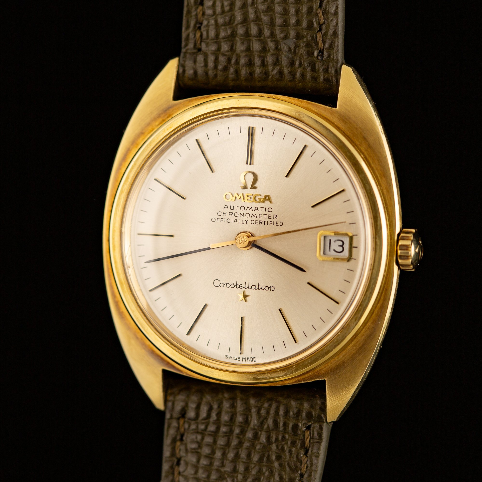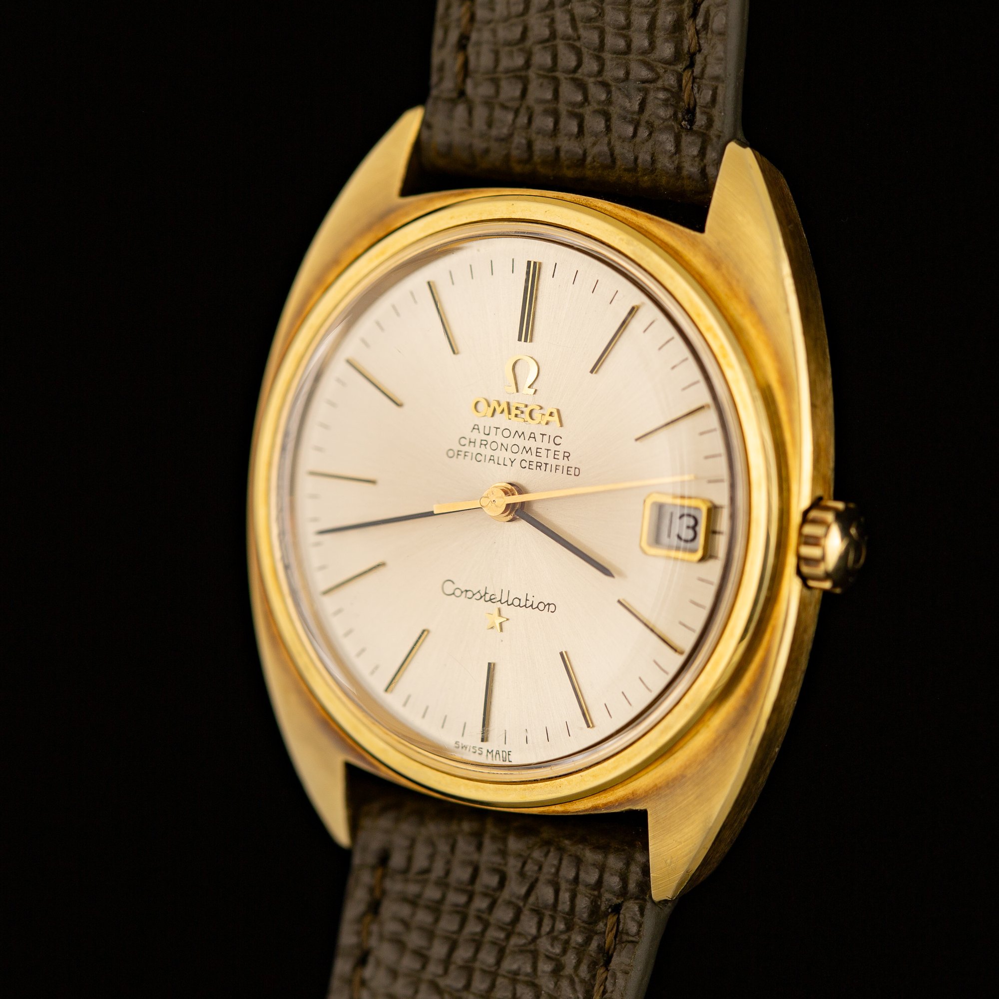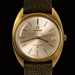 The 34mm gold-plated case houses a factory sunburst champagne dial with the applied Omega logo beneath twelve, the “Chronometer Officially Certified” designation, and the applied gold Constellation star at six o’clock. Applied gold baton hour markers with black lacquer detailing are paired with black baton hour and minute hands. A framed date window sits at three o’clock. The watch retains its signed Omega crown and signed Omega crystal.