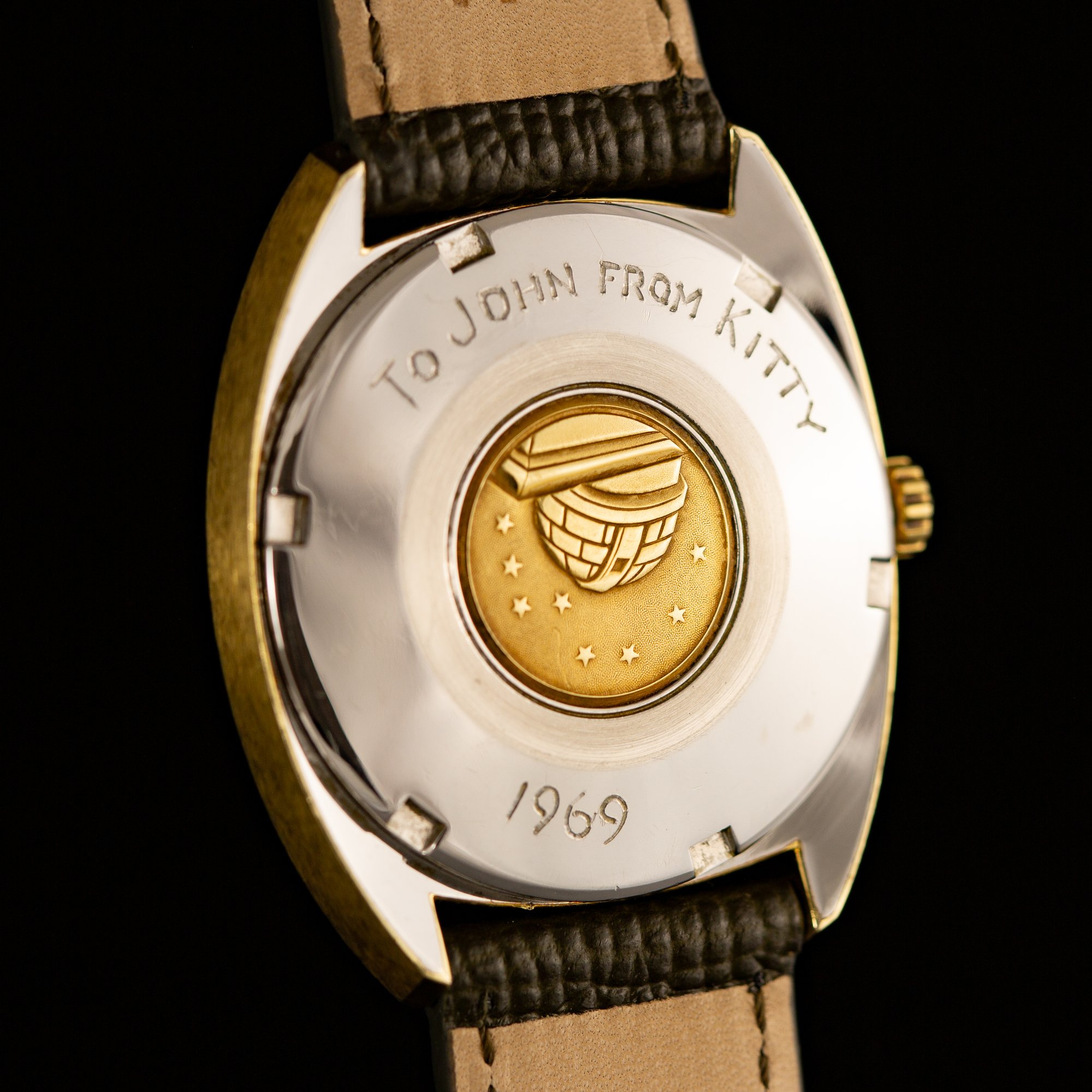 The case is in good overall condition, showing oxidation to the brushed surfaces along with scuffs and scratches consistent with age, but no major damage. The signed crystal shows minor scratches. The caseback bears a personalized engraving reading, “To John from Kitty – 1969.”