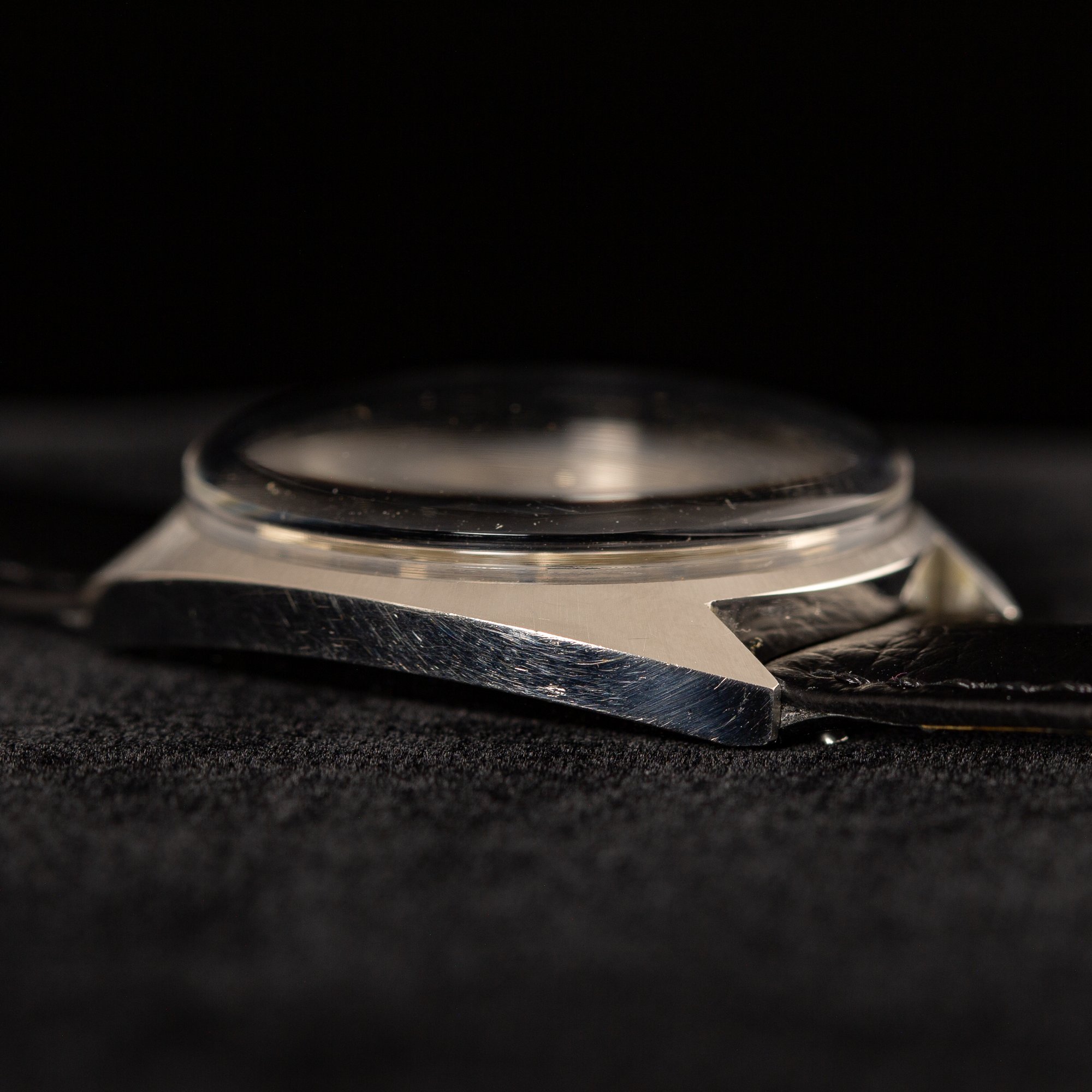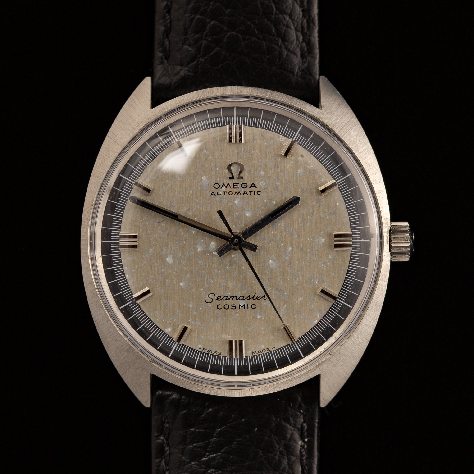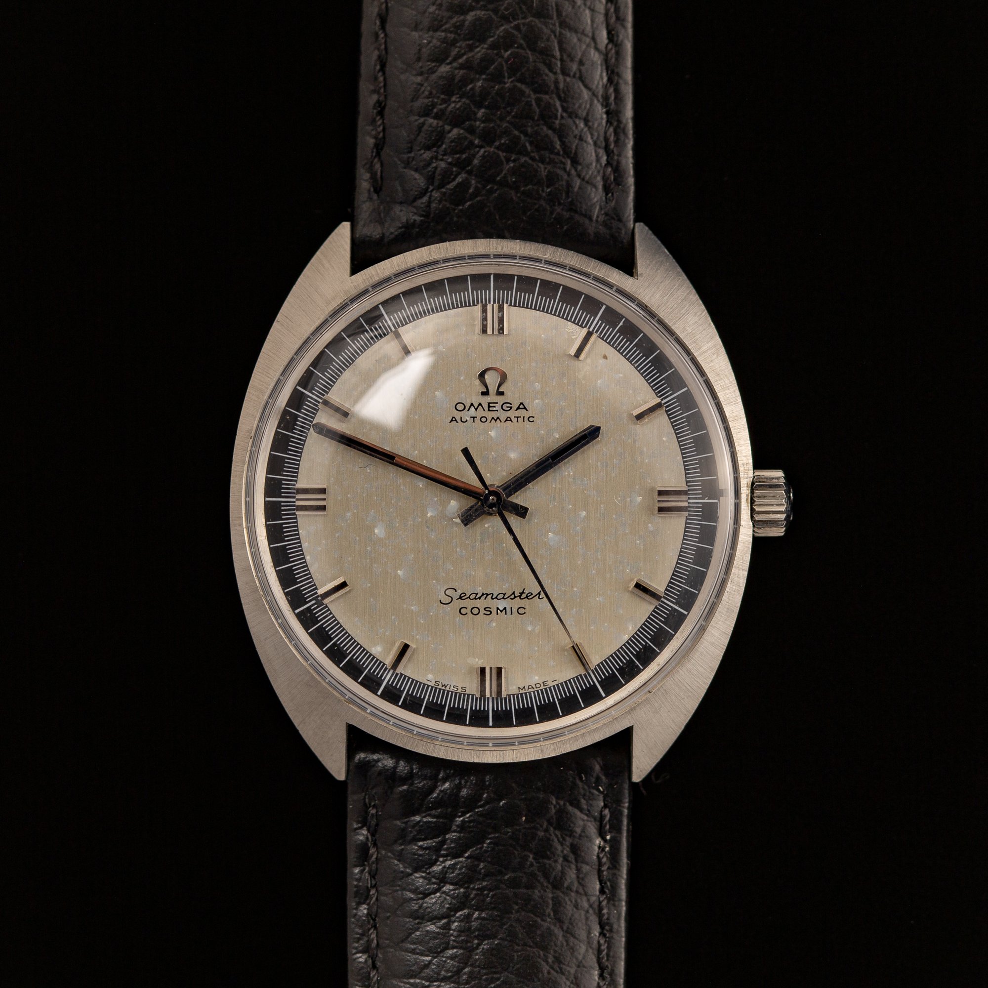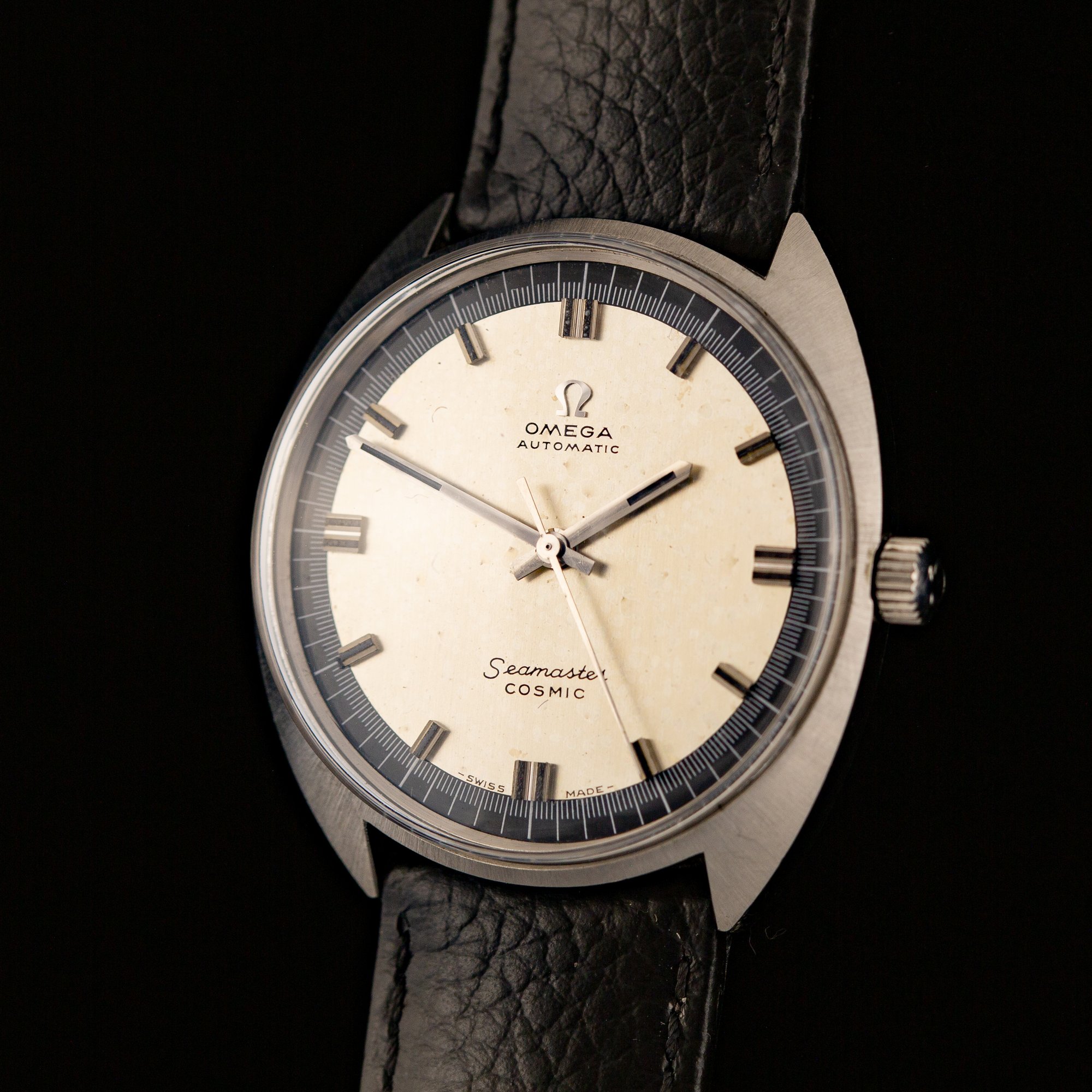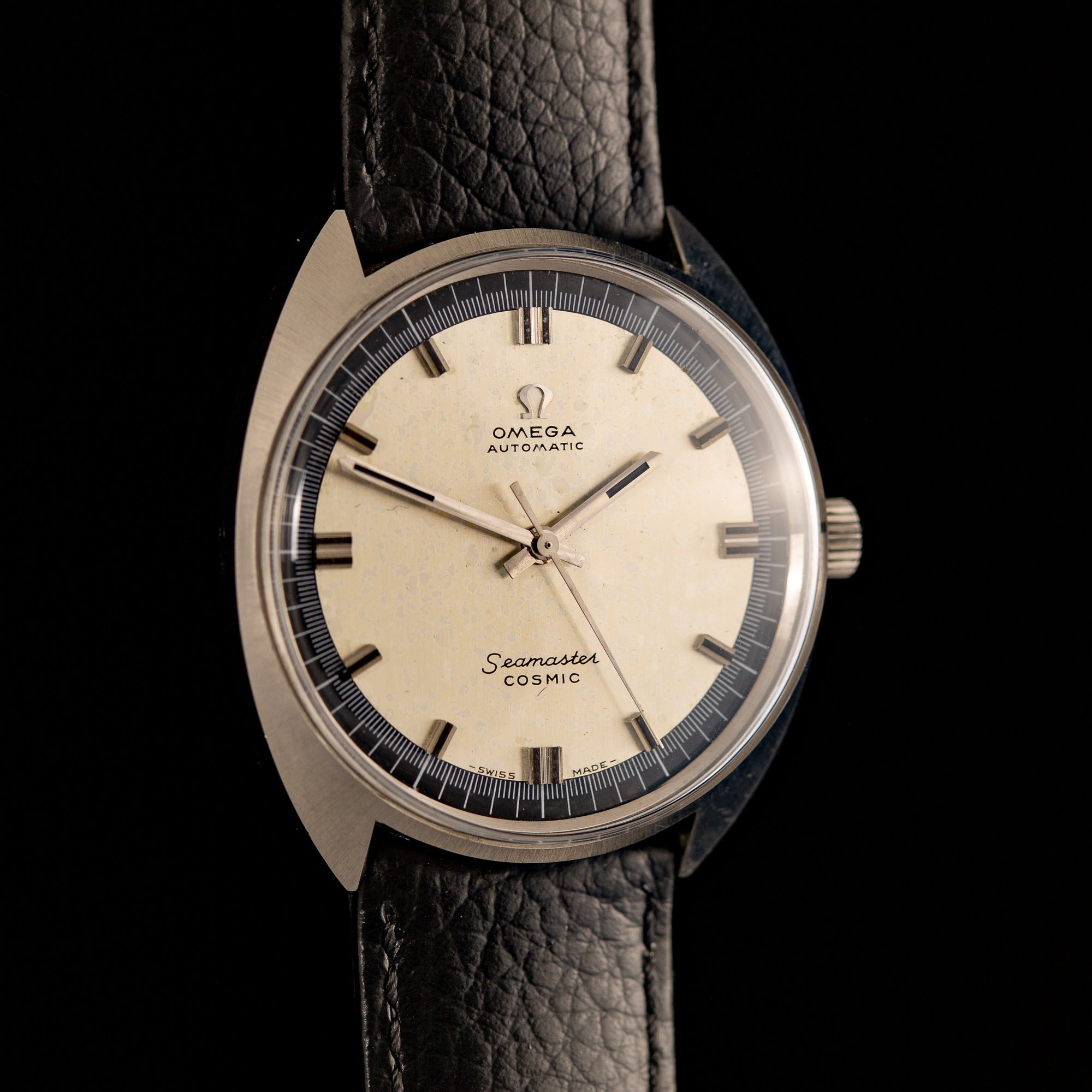 A 1968 Omega Seamaster Cosmic Ref. 165.026, part of Omega’s late-1960s Cosmic line known for its monocoque case construction and streamlined design.
