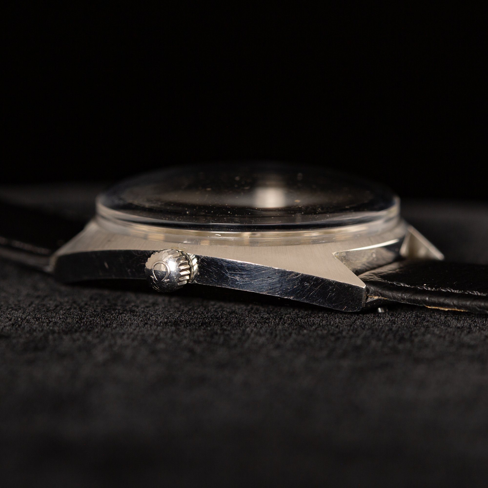 The 35mm stainless steel monocoque case houses a uniquely aged, speckled silver dial, featuring the applied Omega logo at twelve o’clock and an outer minute and seconds track. Baton hour markers are paired with baton hour and minute hands and a central seconds hand. The watch retains its signed crown.