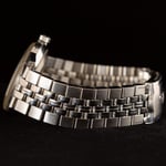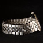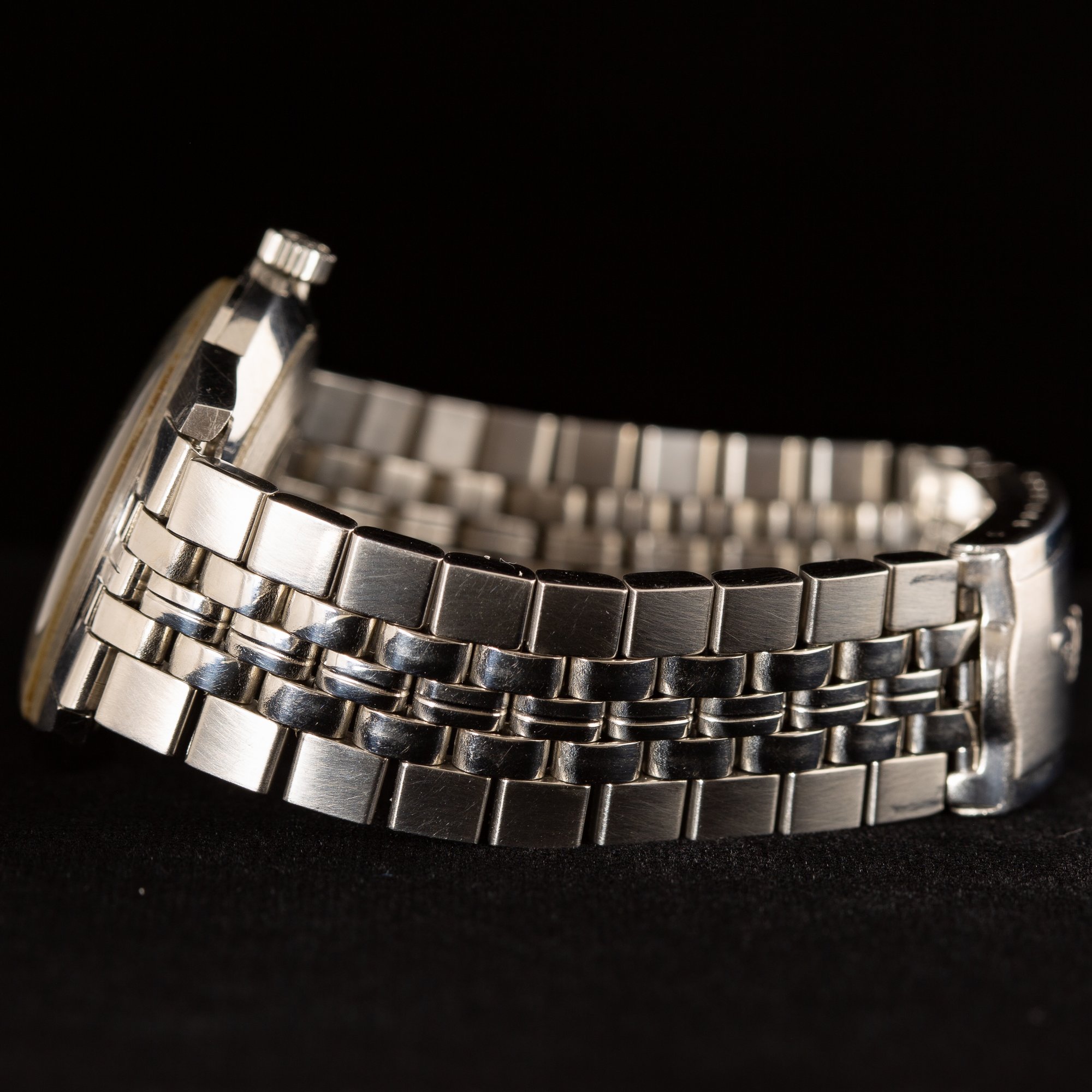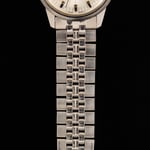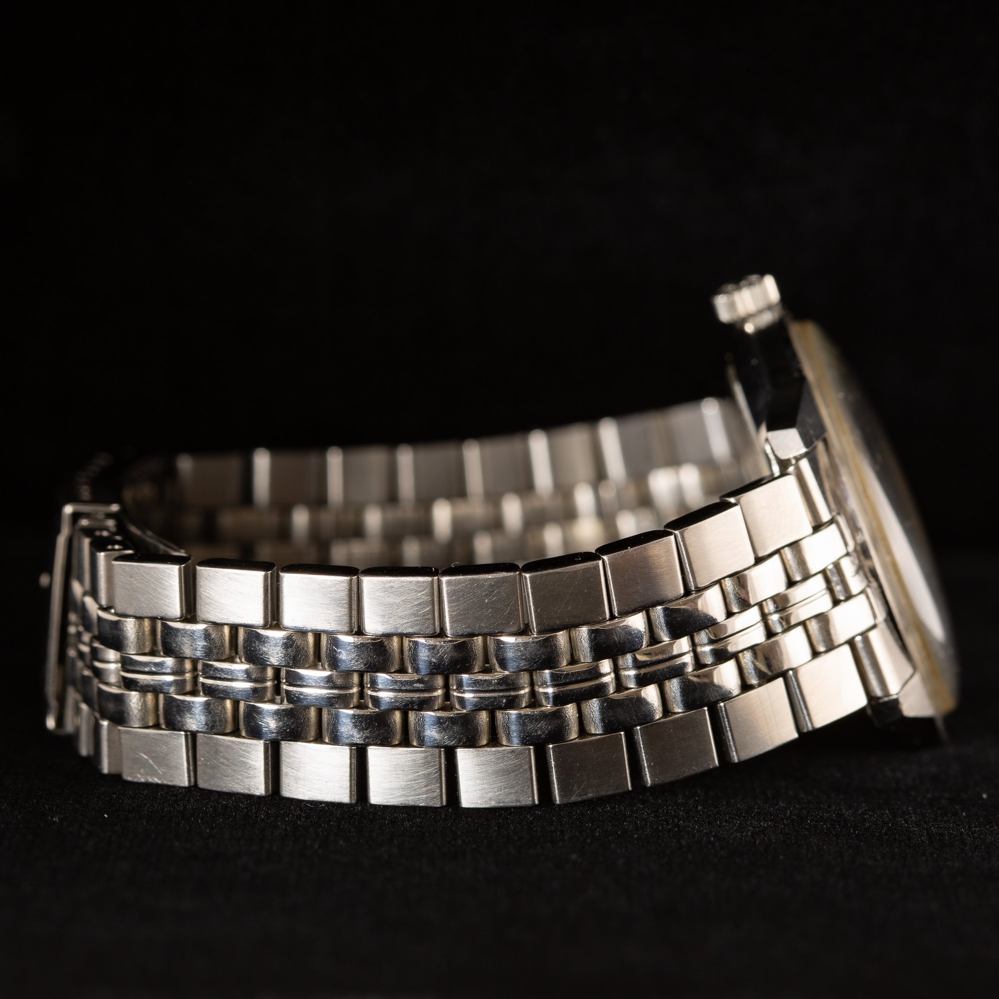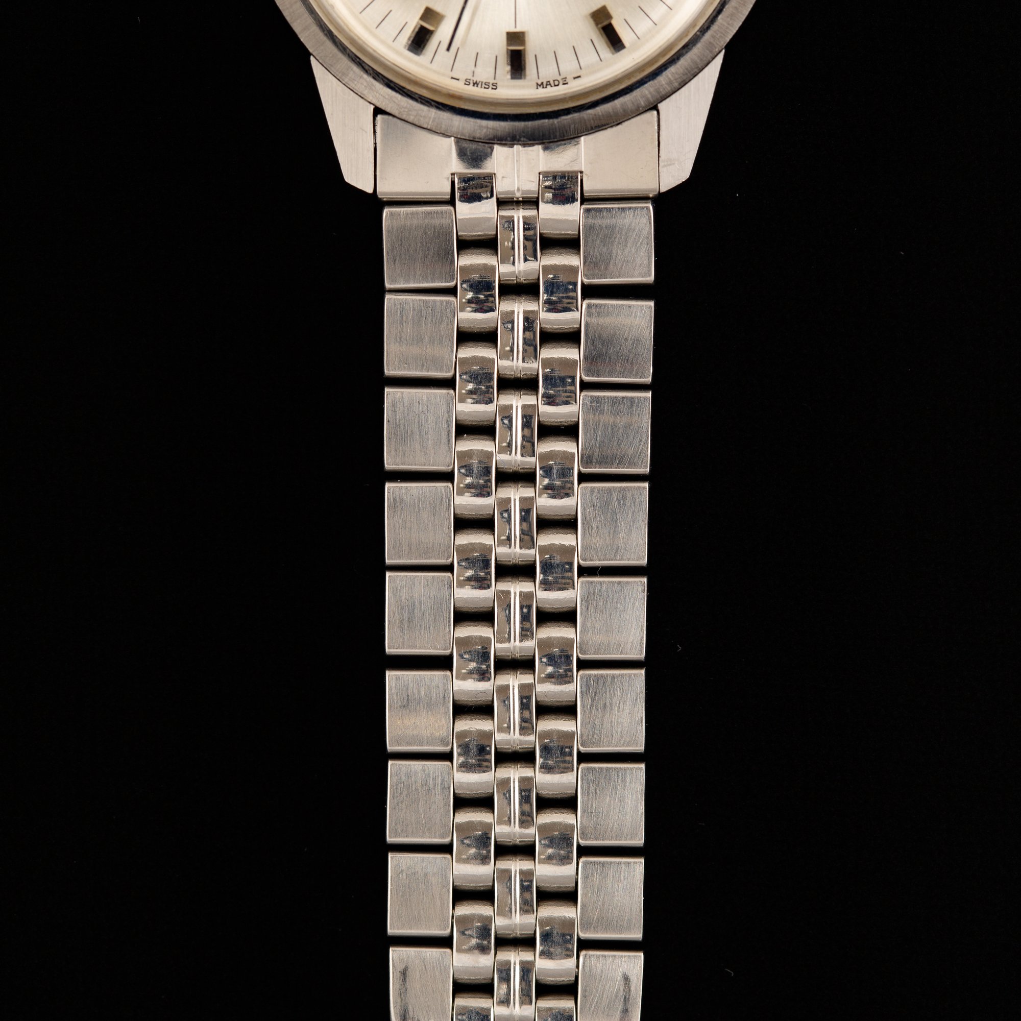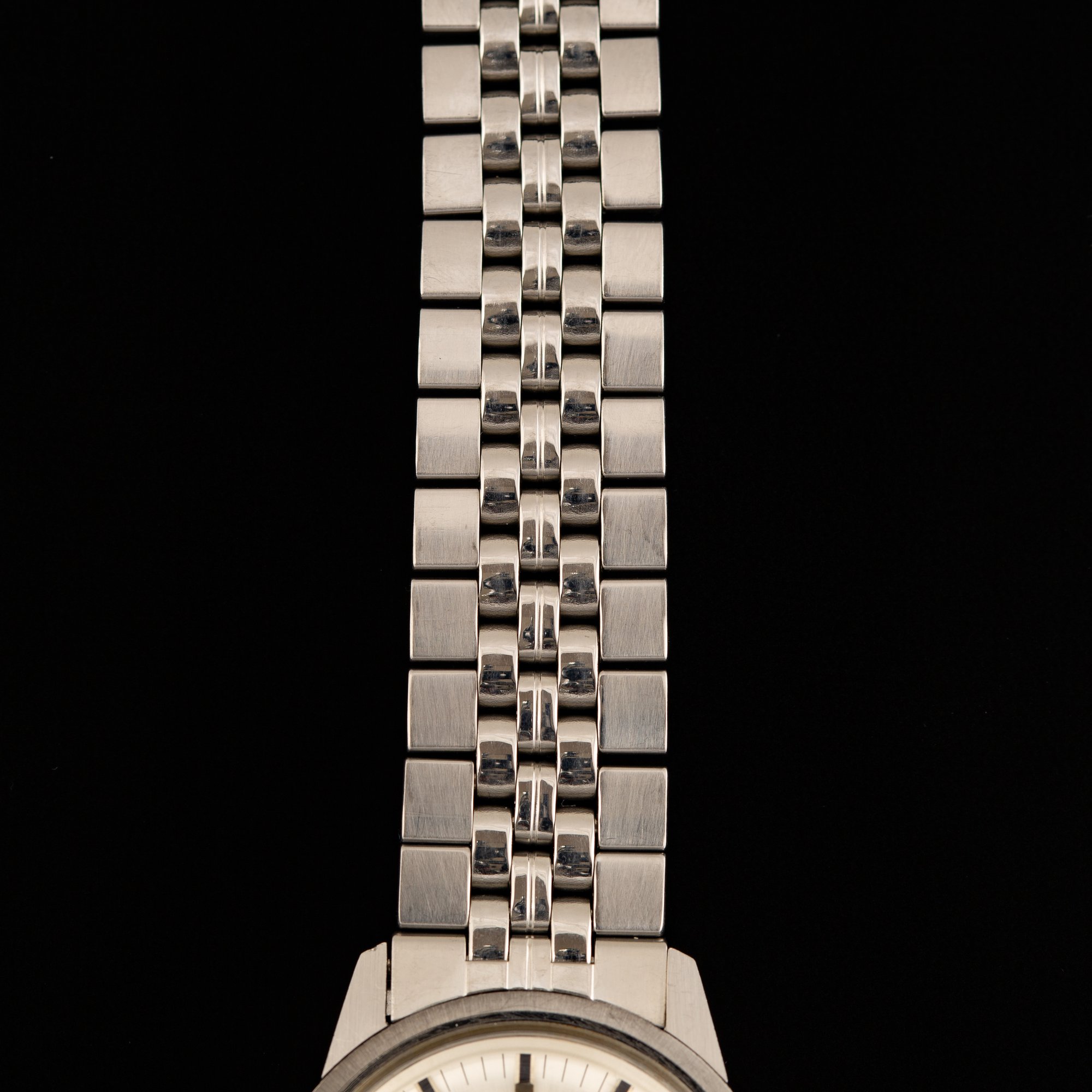 The 34.5mm stainless steel case houses a factory-finished silverburst crosshair dial. Applied silver and black "doorstop" hour markers are paired with matching hands. A framed date window is positioned at three o'clock. The watch retains its original signed crown and is fitted on its original brick-link bracelet, which accommodates up to a 19cm wrist. The slim 10.5mm profile sits comfortably on the wrist and wears exceptionally well.