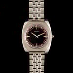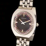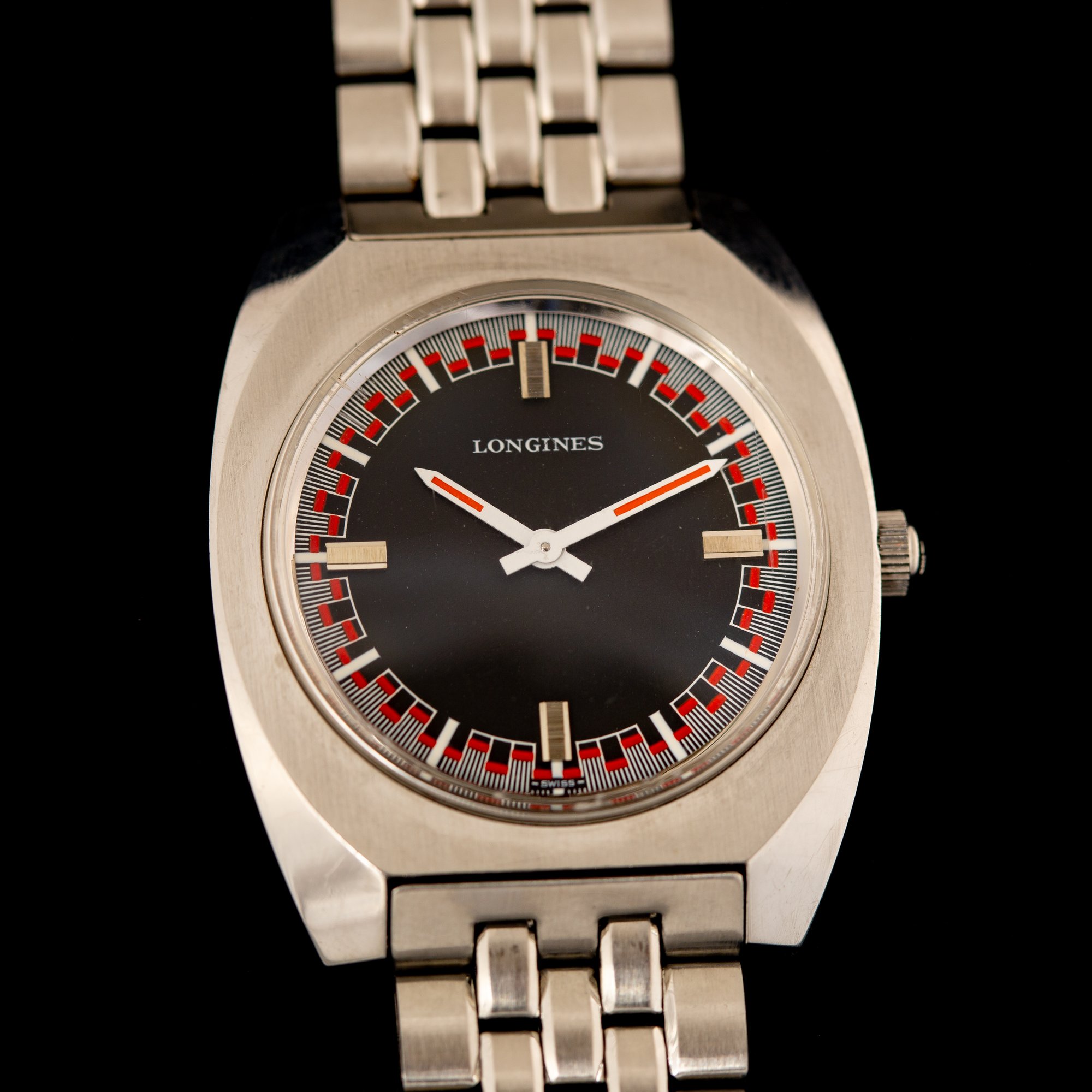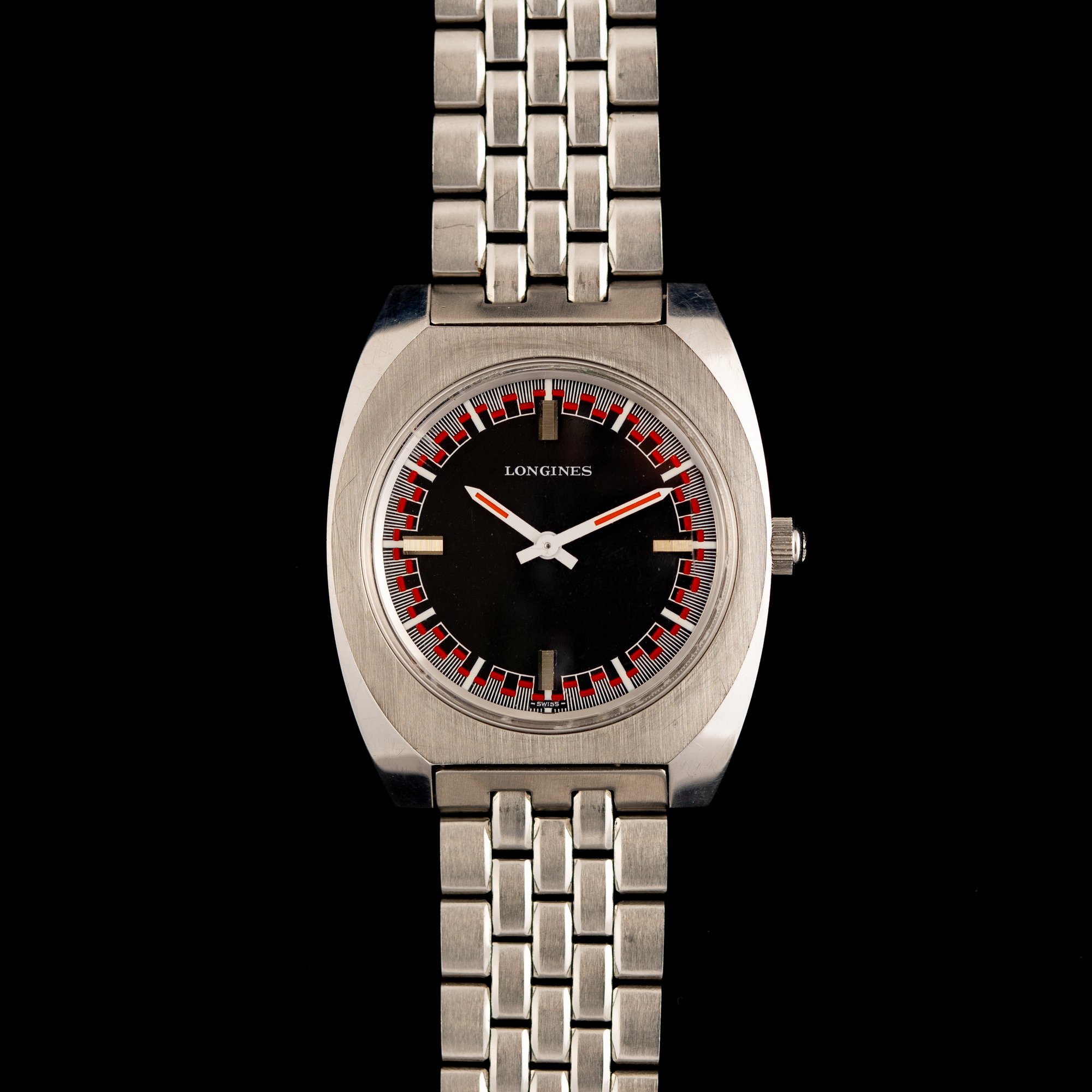 The 34mm stainless steel angular cushion case offers a slim 8.5mm profile and 40.5mm lug-to-lug length for a comfortable presence on the wrist, completed by a signed crown. Its factory-finished black dial is framed by a vibrant red and white outer track, complemented by contrasting white and red hands and silver baton hour markers at 3, 6, 9, and 12. Paired with its original stainless steel Longines bracelet, which retains all links and can accommodate larger wrists.