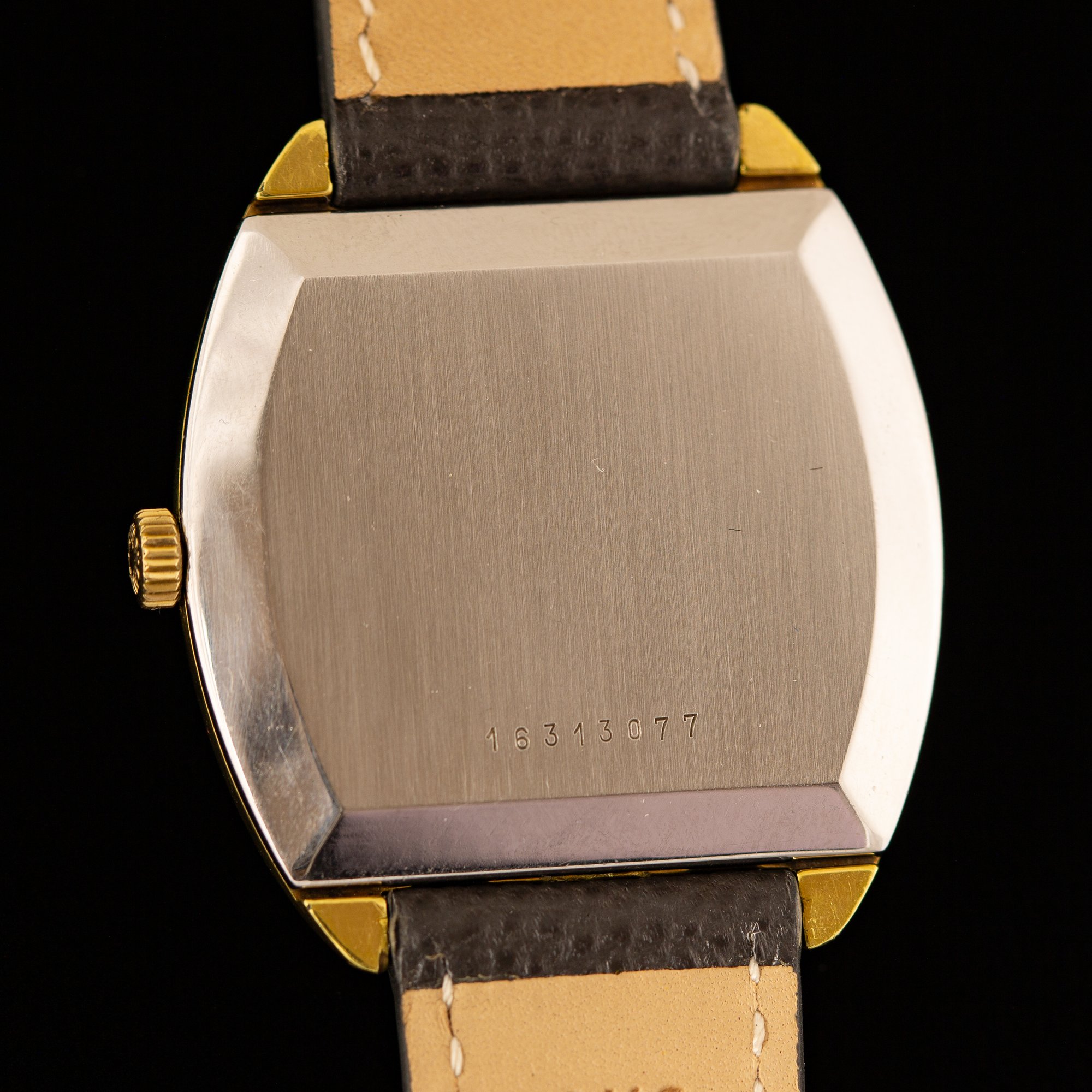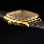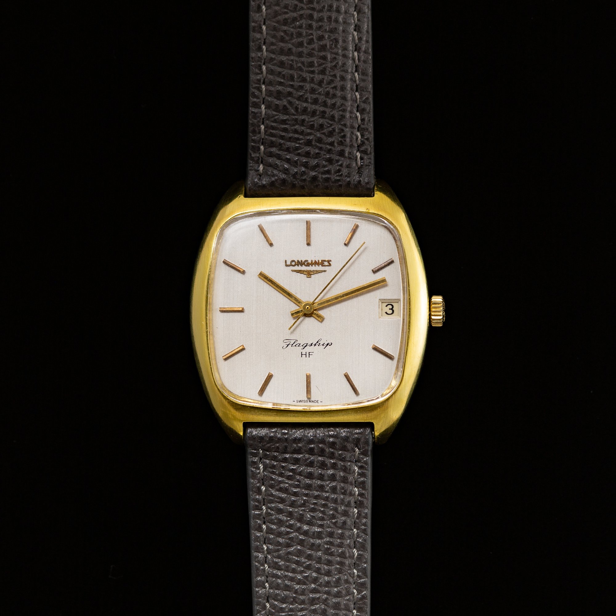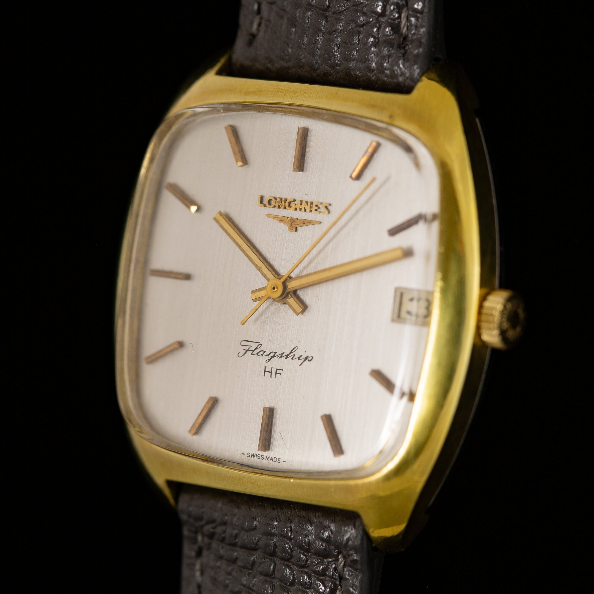 This 1974 Longines Flagship Ref. 4006-1 is an HF (High Frequency) model, featuring a 34x32mm gold-plated case and a factory-finished silver dial with applied stick hour markers and gold baton hands. With a signed gold-plated crown, 10mm thickness, and 38mm lug-to-lug, it wears comfortably on the wrist.