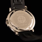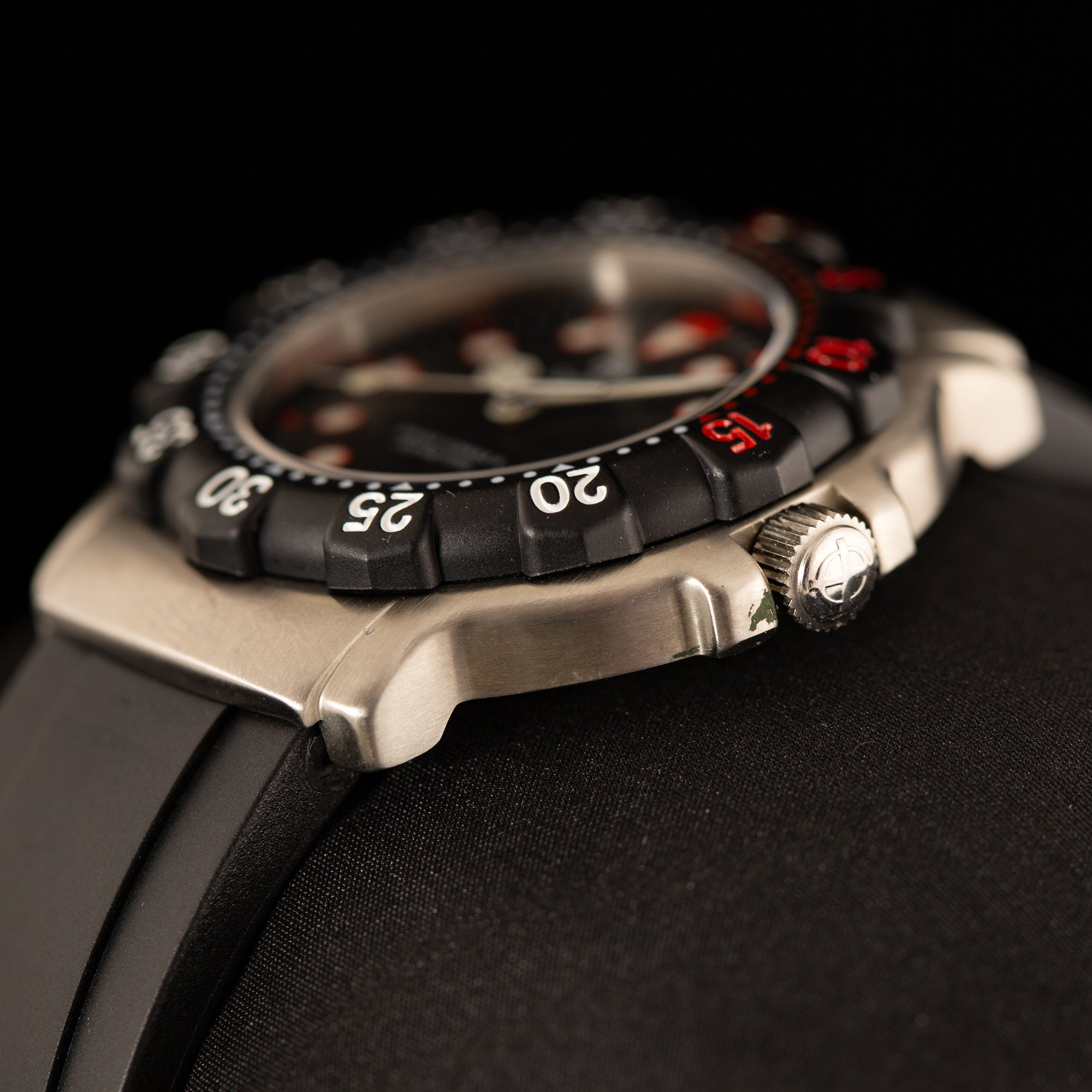 New old stock and unworn, the watch shows a visible scratch on the crown guard. Paired with a black FKM rubber strap.